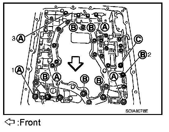 66. Install bolts (A), (B) and (C) in control valve with TCM. Tighten bolt 1, 2 and 3 temporarily to prevent dislocation. After that tighten them in order (1 to 2 to 3), and then tighten other bolts.