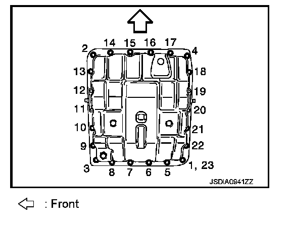 76. Tighten oil pan mounting bolts to the specified torque in numerical order shown in the figure after temporarily tightening them.