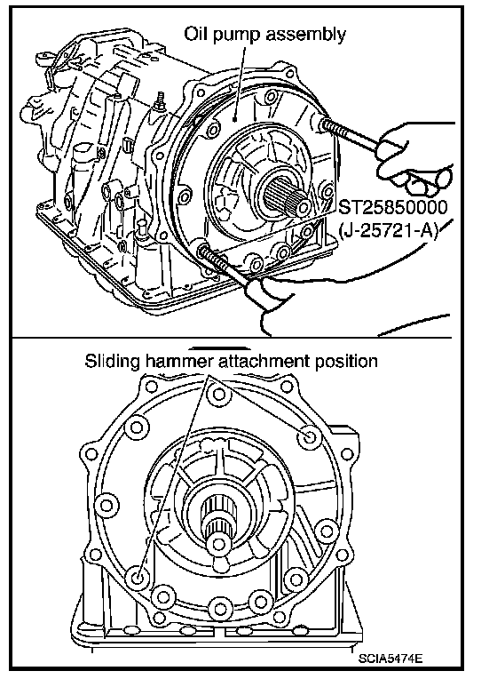 7. Attach the sliding hammers to oil pump assembly and extract it evenly from transmission case.