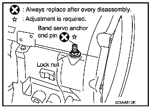 14. Loosen lock nut and remove band servo anchor end pin from transmission case.