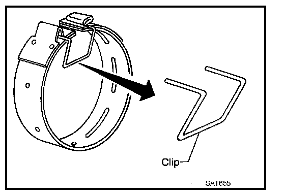 - To prevent brake linings from cracking or peeling, do not stretch the flexible band unnecessarily. When removing the brake band, always secure it with a clip as shown in the figure at right.