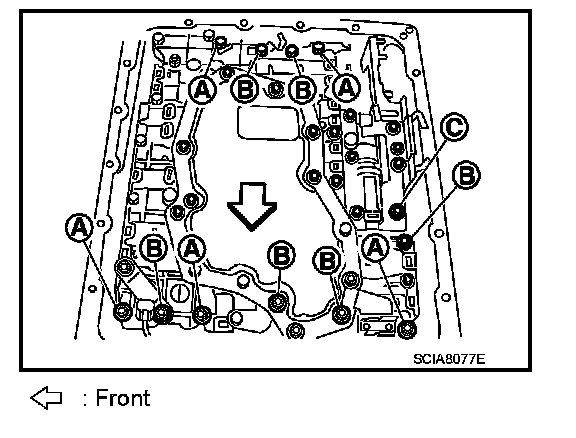 35. Remove bolts (A), (B) and (C) from control valve with TCM.