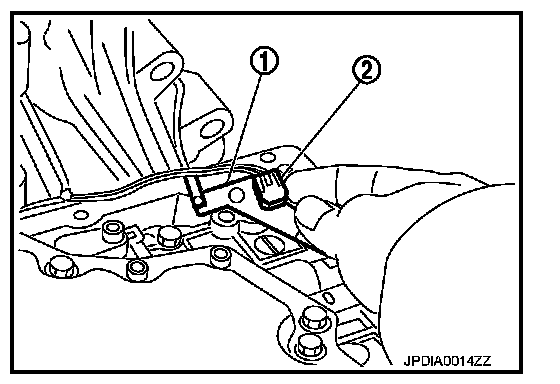 38. Remove bracket (1) from A/T fluid temperature sensor 2 (2).