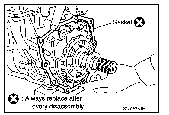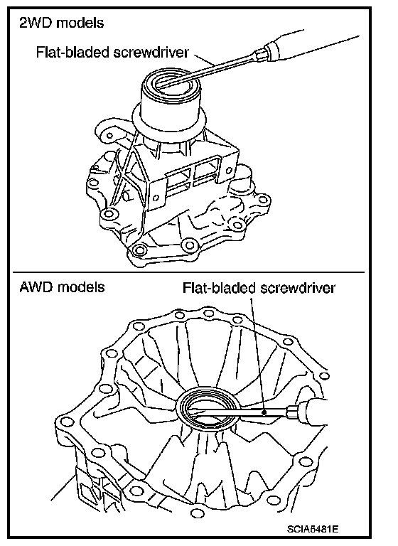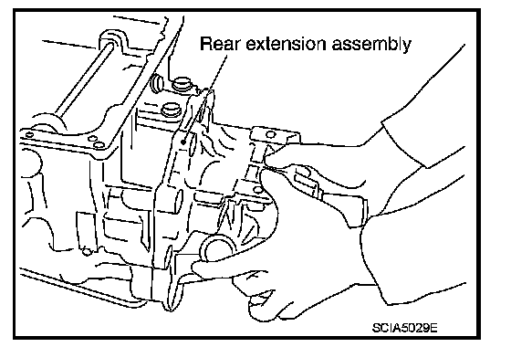 43. Remove rear extension assembly (2WD) or adapter case assembly (AWD) according to the following procedures.