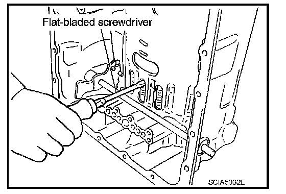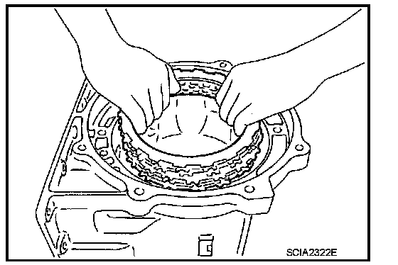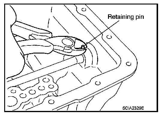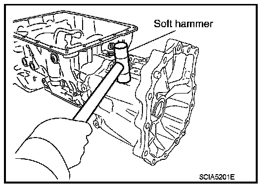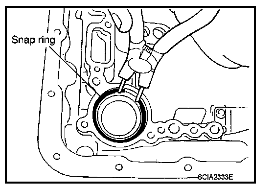 Press out snap ring from the transmission case oil pan side gap using a flat-bladed screwdriver, and remove it using a another screwdriver.