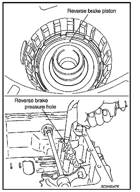 54. Remove reverse brake piston from transmission case with compressed air. Refer to Oil Channel.