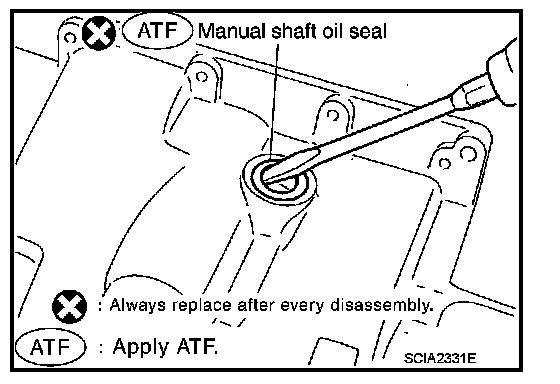 61. Remove manual shaft oil seals with a flat-bladed screwdriver.