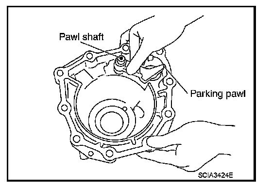 69. Remove parking pawl (with return spring) and pawl shaft from rear extension (2WD) or adapter case (AWD).