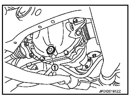 3. Set a gasket on drain plug (1) and install it to final drive assembly and tighten to the specified torque. Refer to Exploded View, "2WD