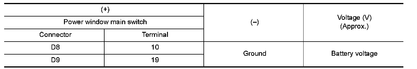 4. Check voltage between power window main switch harness connector and ground.