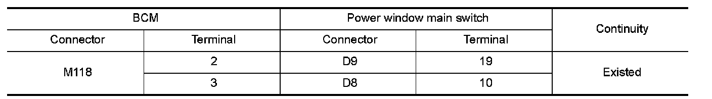 3. Check continuity between BCM harness connector and power window main switch harness connector.