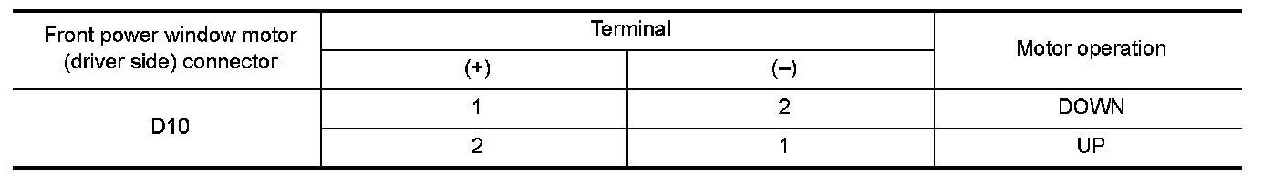 3. Check motor operation by connecting the battery voltage directly to front power window motor (driver side) terminals.