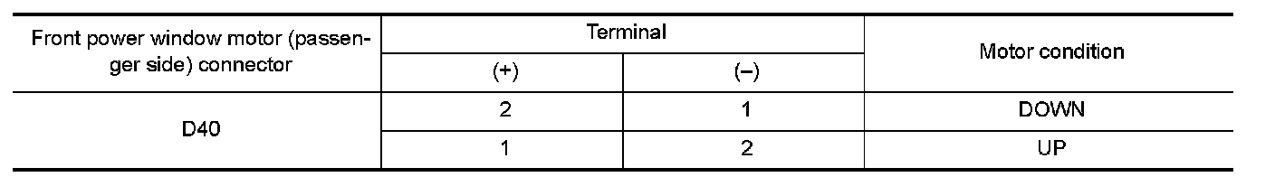 3. Check motor operation by connecting the battery voltage directly to front power window motor (passenger side) terminals.