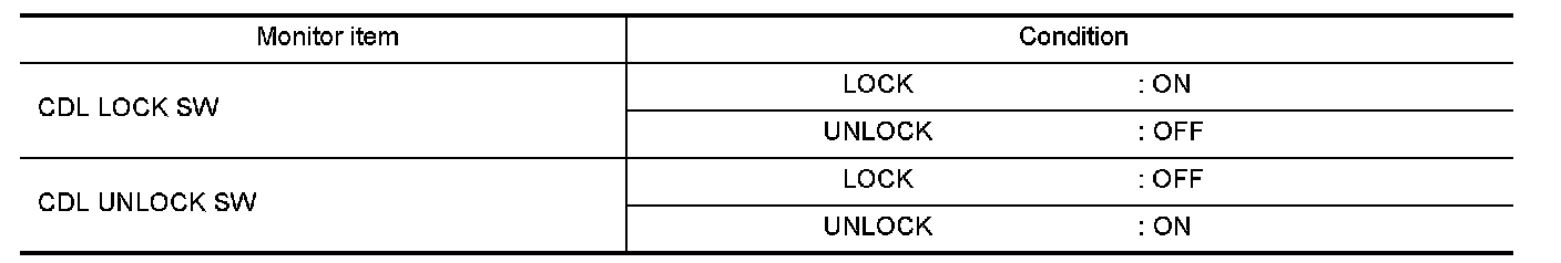 Check ("CDL LOCK SW ", "CDL UNLOCK SW") in "DATA MONITOR" mode for "POWER DOOR LOCK SYSTEM" with CONSULT-III. Refer to Door Lock .