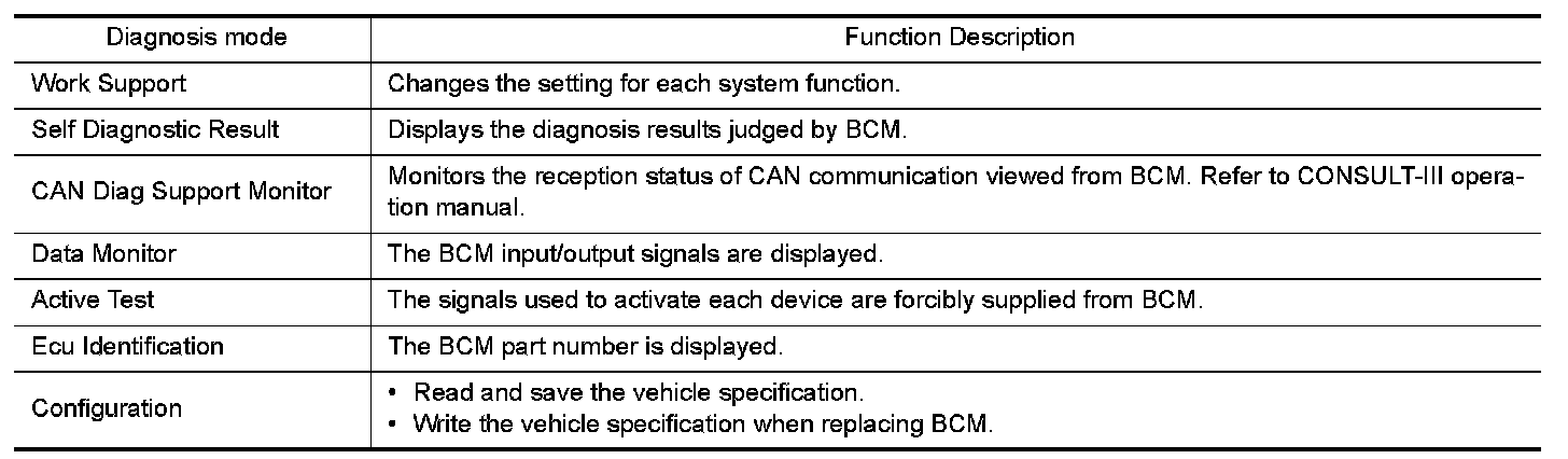 CONSULT-III performs the following functions via CAN communication with BCM.