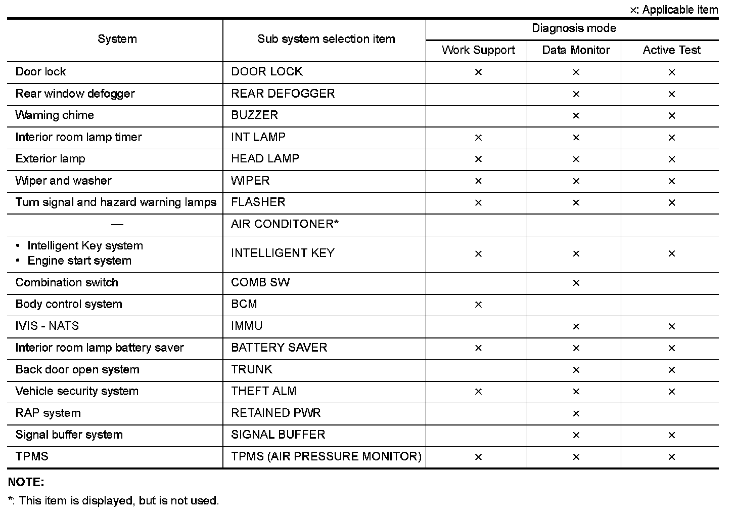 It can perform the diagnosis modes except the following for all sub system selection items.