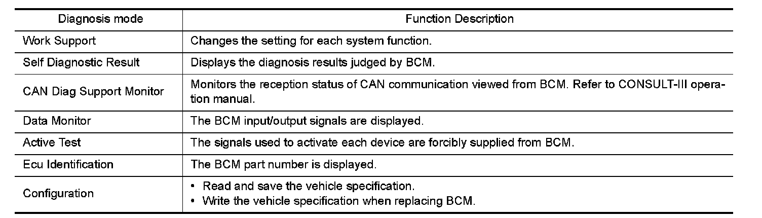 CONSULT-III performs the following functions via CAN communication with BCM.
