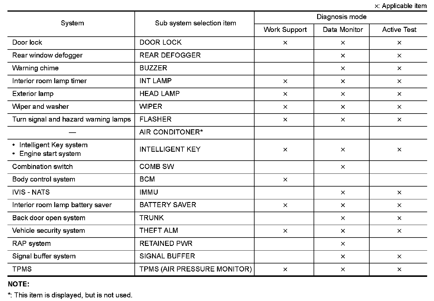 It can perform the diagnosis modes except the following for all sub system selection items.