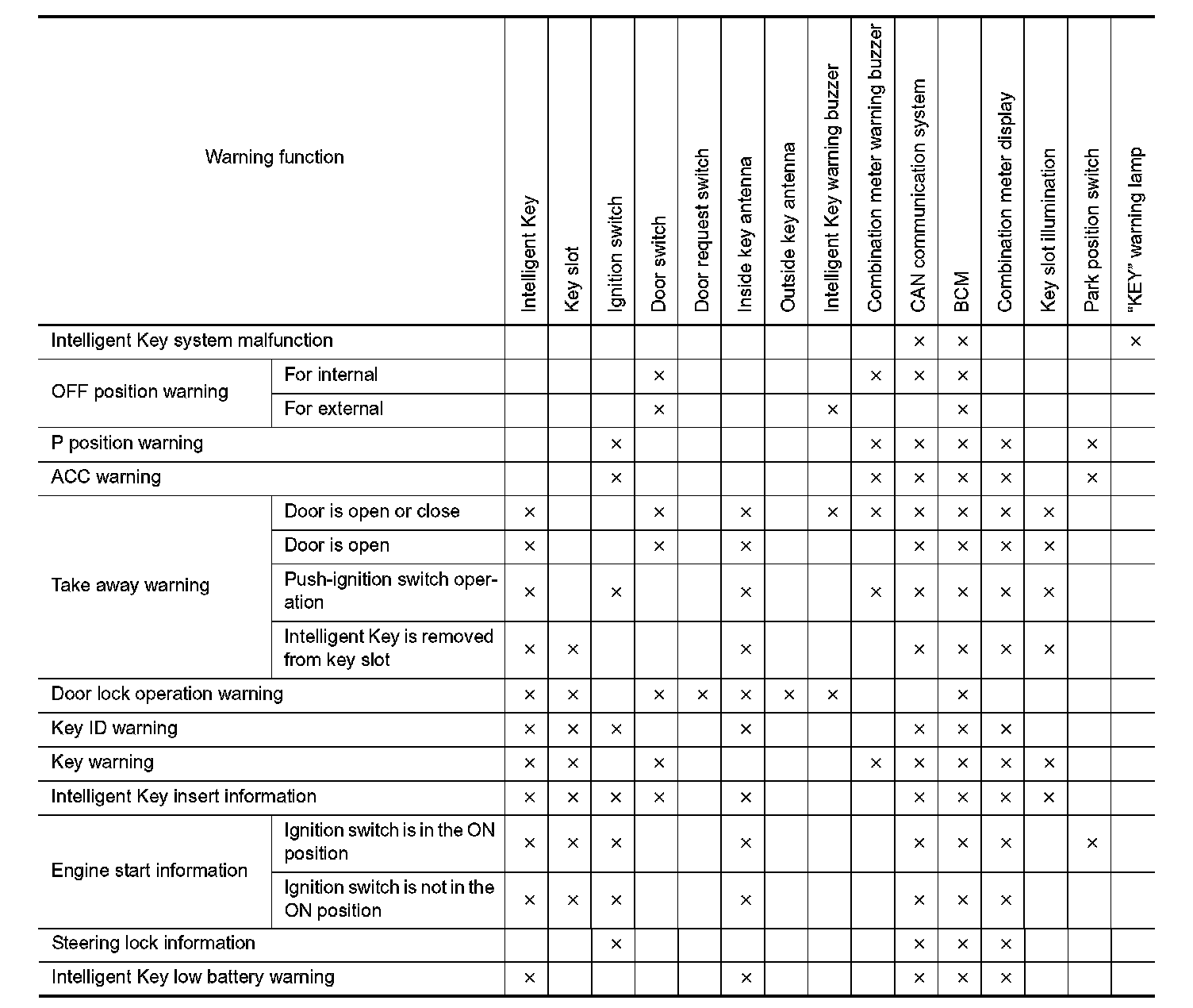 The warning functions are as per the following and are given to the user as warning information and warnings using combinations of Intelligent Key warning buzzer, KEY warning lamp, key slot illumination and information displayed on combination meter.