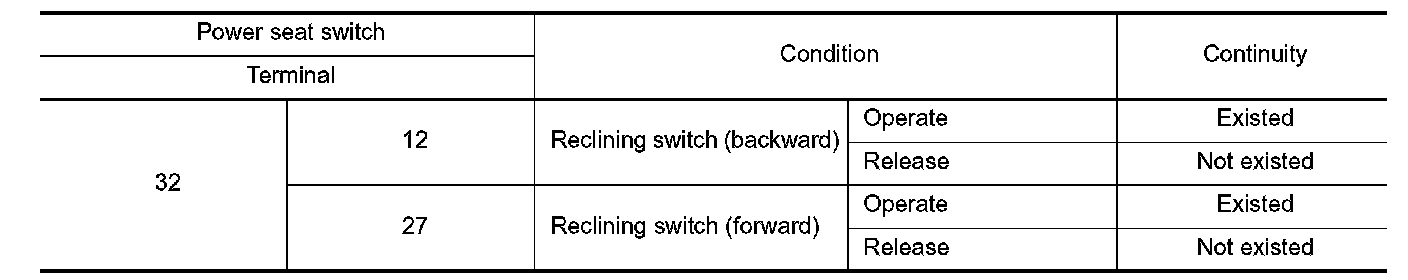 3. Check continuity between power seat switch terminals.