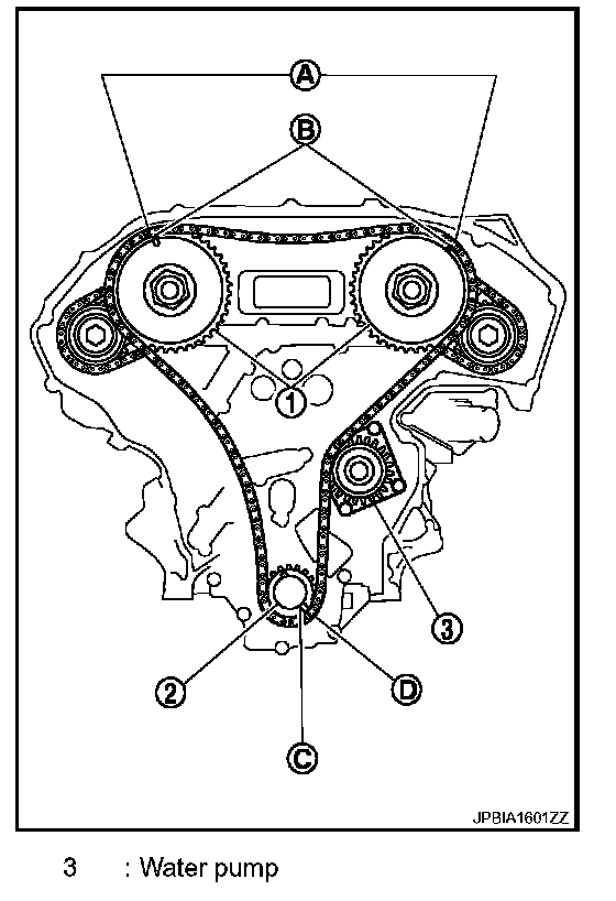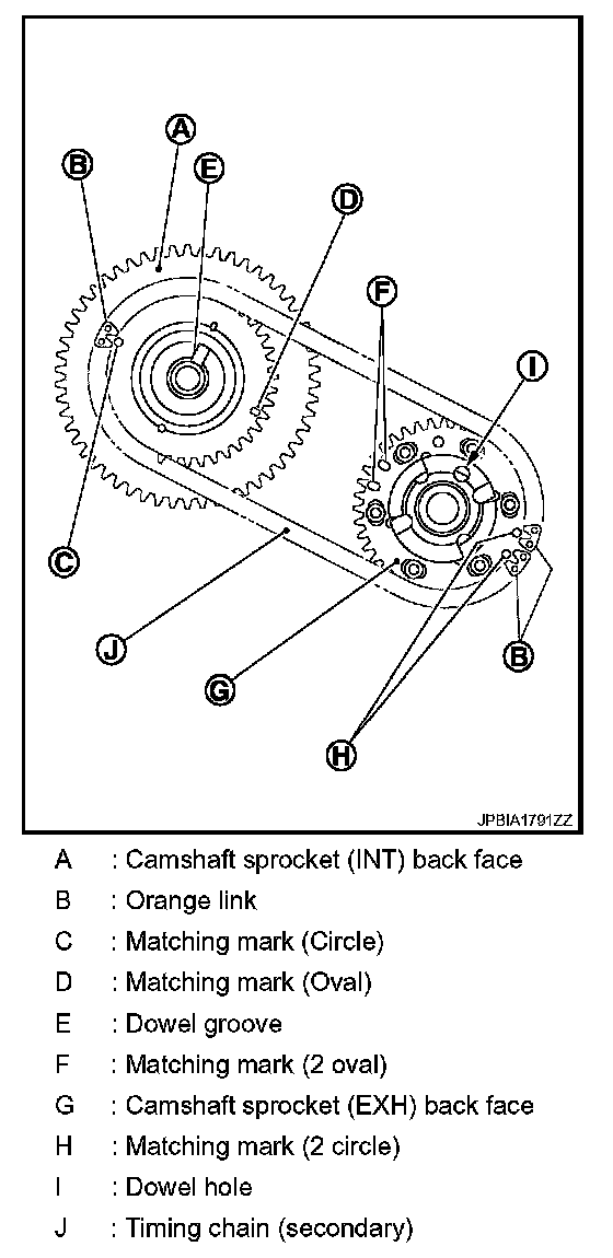 (B) on camshaft sprocket (INT) (1) is aligned with the yellow link (A) on timing chain, while the matching mark (notched) (C) on crankshaft sprocket (2) is aligned with the orange link (D) one on timing chain, as shown in the figure.