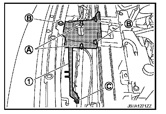 5. Remove mounting bolts (B) and nut (C), and then remove hood lock stay assembly (1).