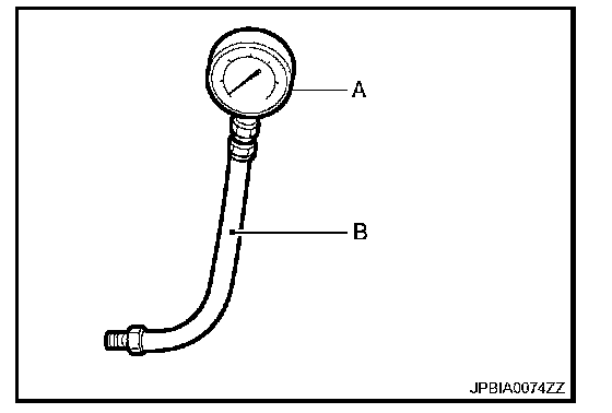 4. Install the oil pressure gauge [SST: ST25051001 (J25695-1)] (A) and hose [SST: ST25052000 (J25695-2)] (B).