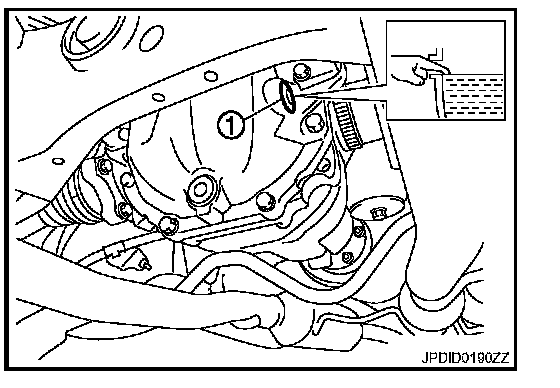 - Remove filler plug (1) and check oil level from filler plug mounting hole as shown in the figure.