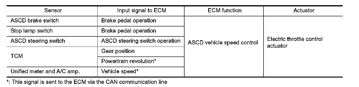 Operation status of ASCD is indicated by CRUISE indicated and SET indicator in combination meter. If any malfunction occurs in the ASCD system, CRUISE lamp blinks and ASCD control is deactivated.