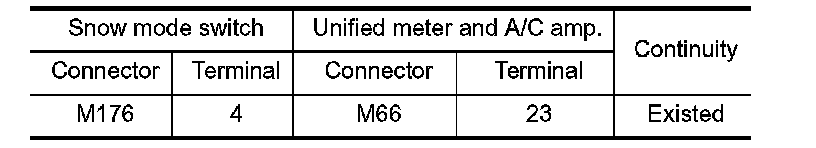 3. Check the continuity between snow mode switch harness connector and "unified meter and A/C amp." harness connector.