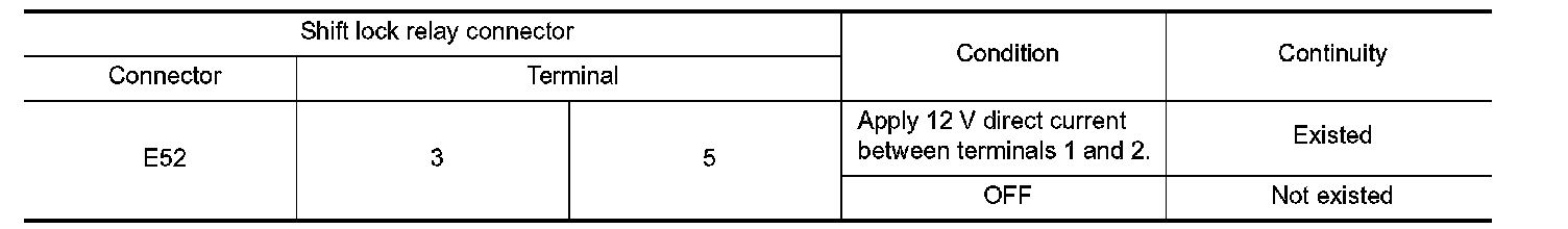 Check continuity between shift lock relay terminals 3 and 5.