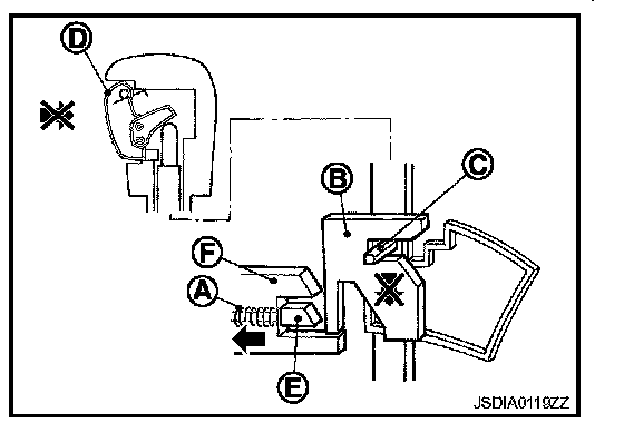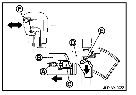 The lock plate (B) lowers according to the downward movement of the position pin (C) when the selector button (D) is pressed, and presses only slider B (E) into the shift lock unit. Slider A (F) located below the lock plate prevents the downward movement of the lock plate with the spring force. The selector lever cannot be shifted from the "P" position for this reason.