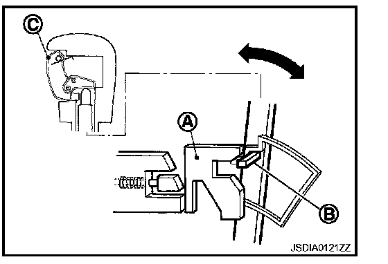 The position pin (B) enters the "P" position thrusting away the lock plate when the selector lever is shifted to the "P" position. Then, the shift mechanism is locked when the selector button (C) is released.