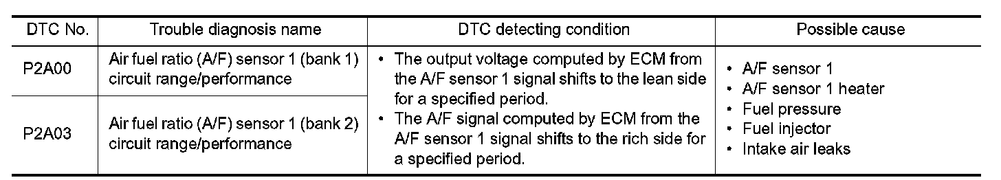 To judge the malfunction, the A/F signal computed by ECM from the A/F sensor 1 signal is monitored so it will not shift to LEAN side or RICH side.