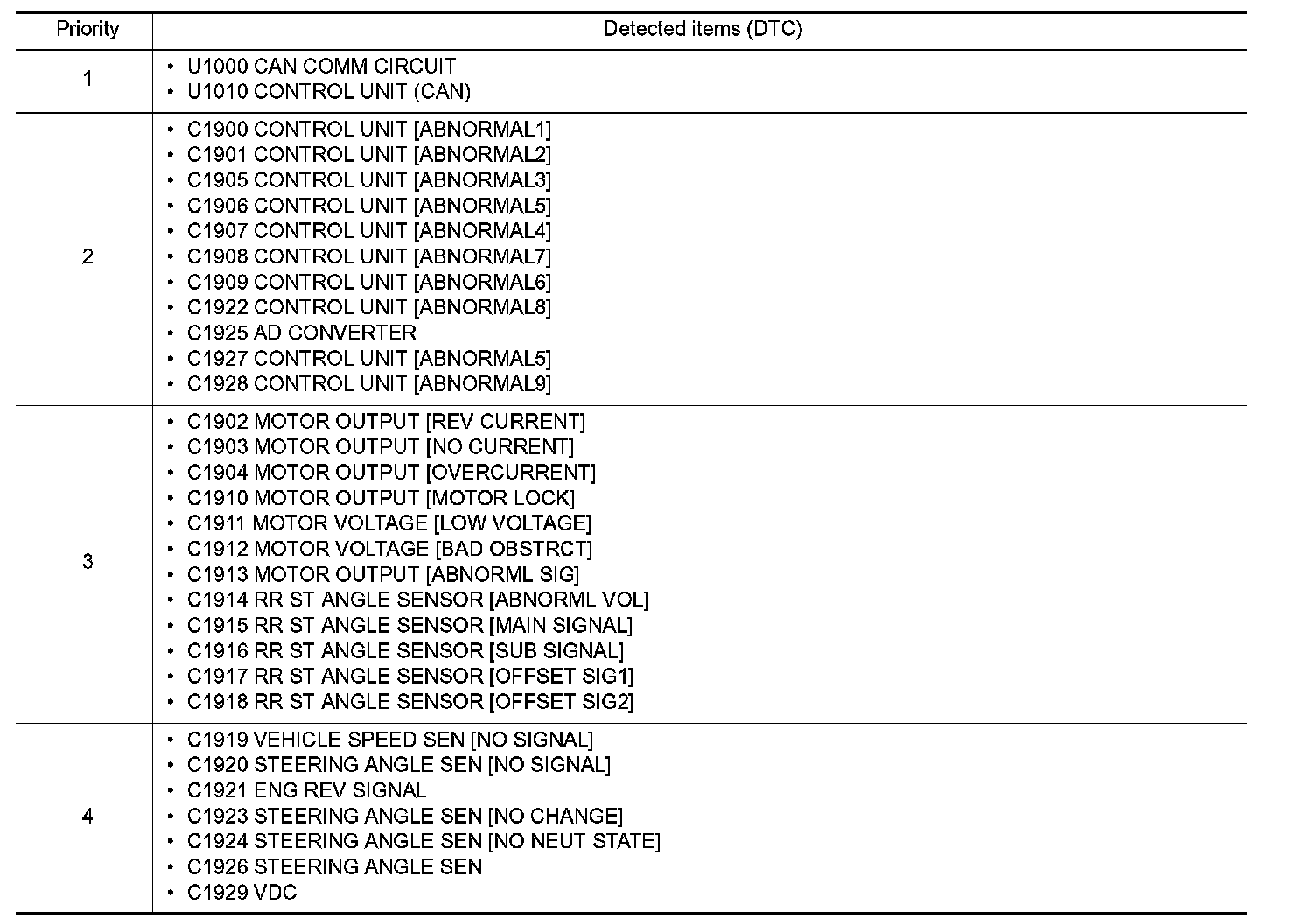 If some DTCs are displayed at the same time, perform inspections one by one based on the following priority chart.
