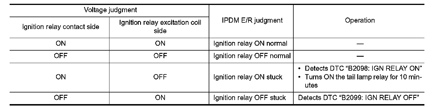 - IPDM E/R judges the ignition relay error if the voltage differs between the contact circuit and the excitation coil circuit.