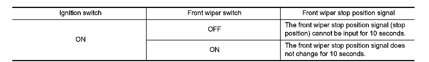 When a front wiper stop position signal is in the conditions listed below, IPDM E/R stops power supply to wiper after repeating a front wiper 10 seconds activation and 20 seconds stop five times.