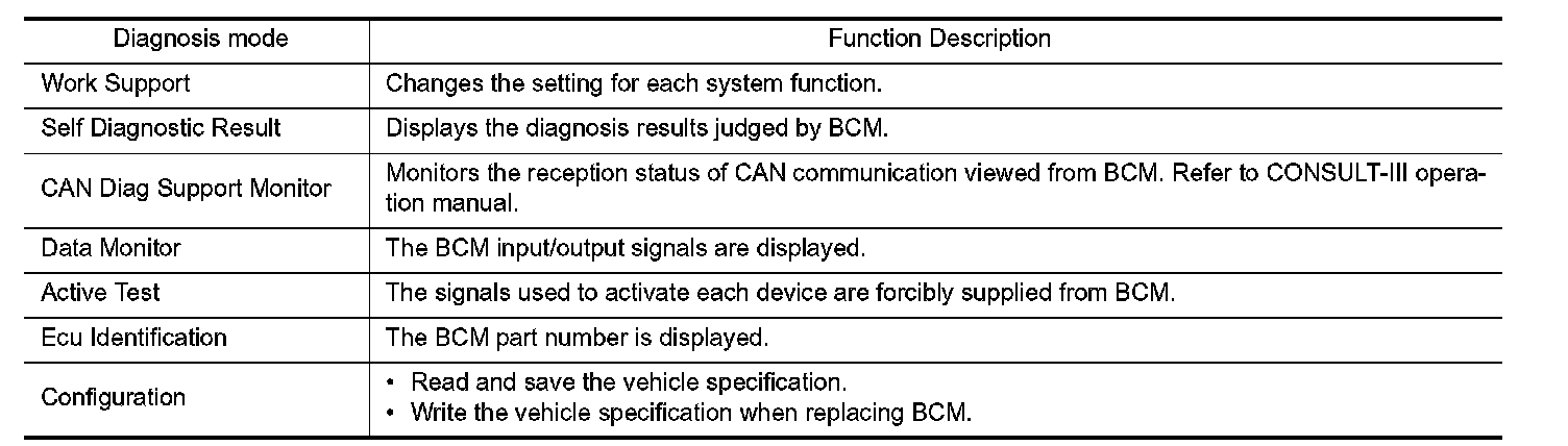 CONSULT-III performs the following functions via CAN communication with BCM.