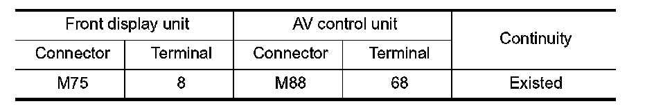 3. Check continuity between front display unit harness connector and AV control unit harness connector.