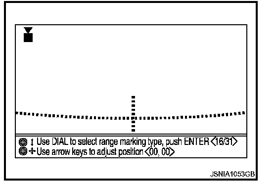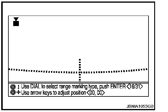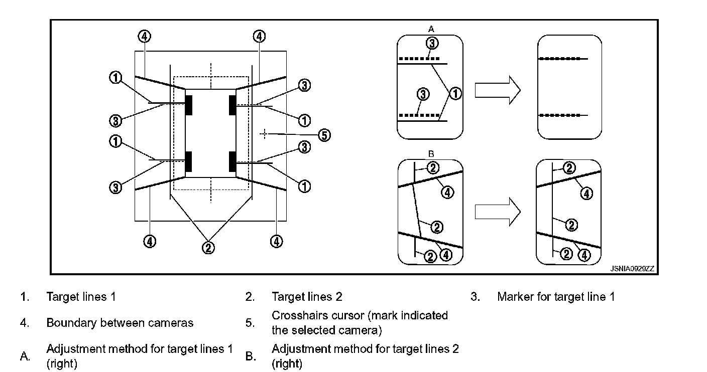 2. Overlap the target lines drawn on the ground with the calibration marker on the screen by operating the center dial and upper/lower/left/right switches of multifunction switch on each screen of "Rear Camera", "Pass-Side Camera", "Front Camera", "DrSide Camera".