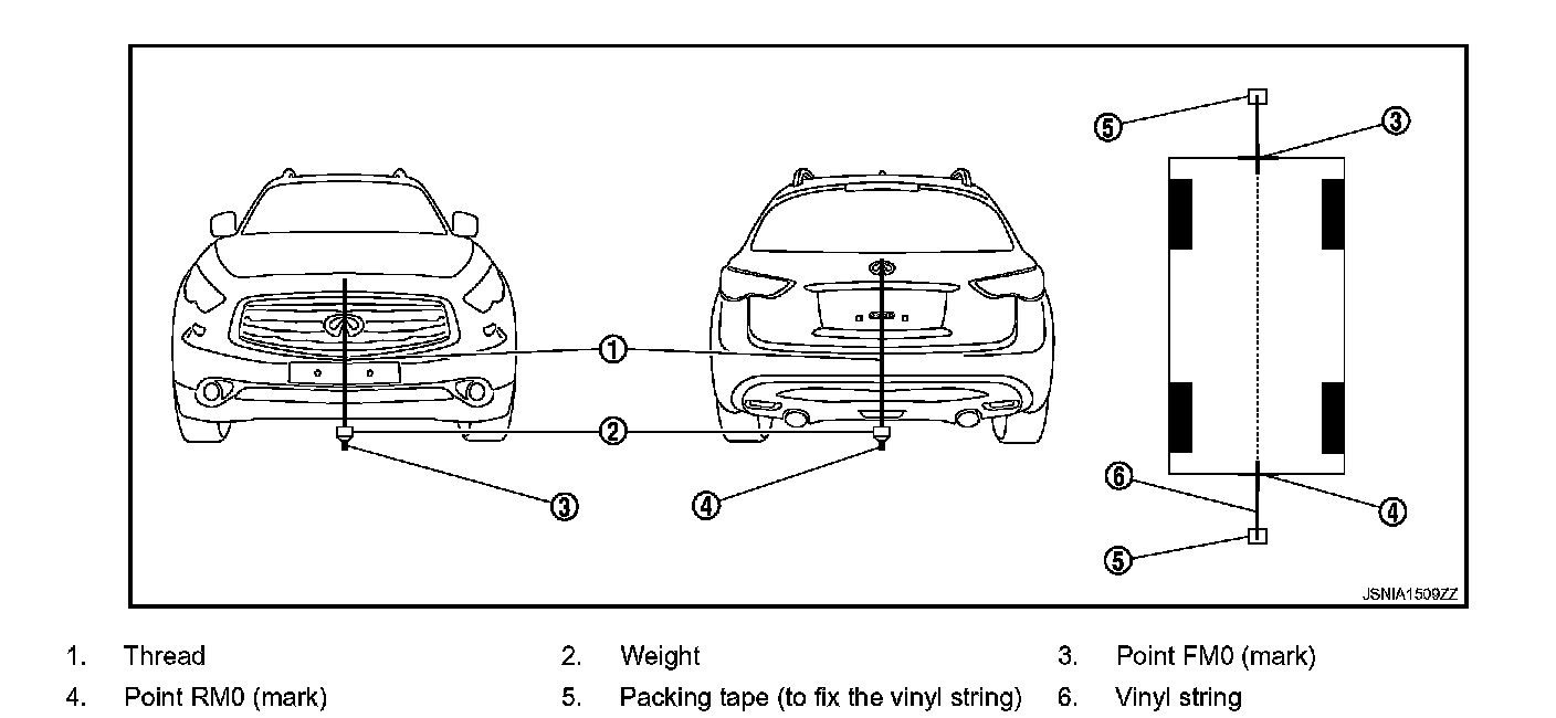 1. Hang a string with a weight as shown in the figure. Put the points FM0, RM0 (mark) on the ground at the center of the vehicle front end and rear end with white packing tape or a pen.
