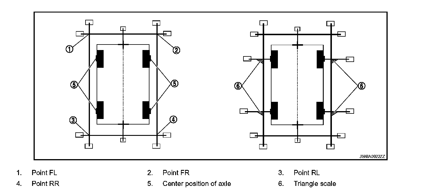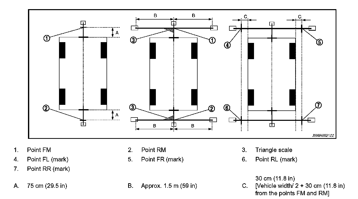 5. Put the points FL, FR, RL, and RR (mark) to both right and left [vehicle width / 2 + 30 cm (11.8 in)] from the points FM and RM.
