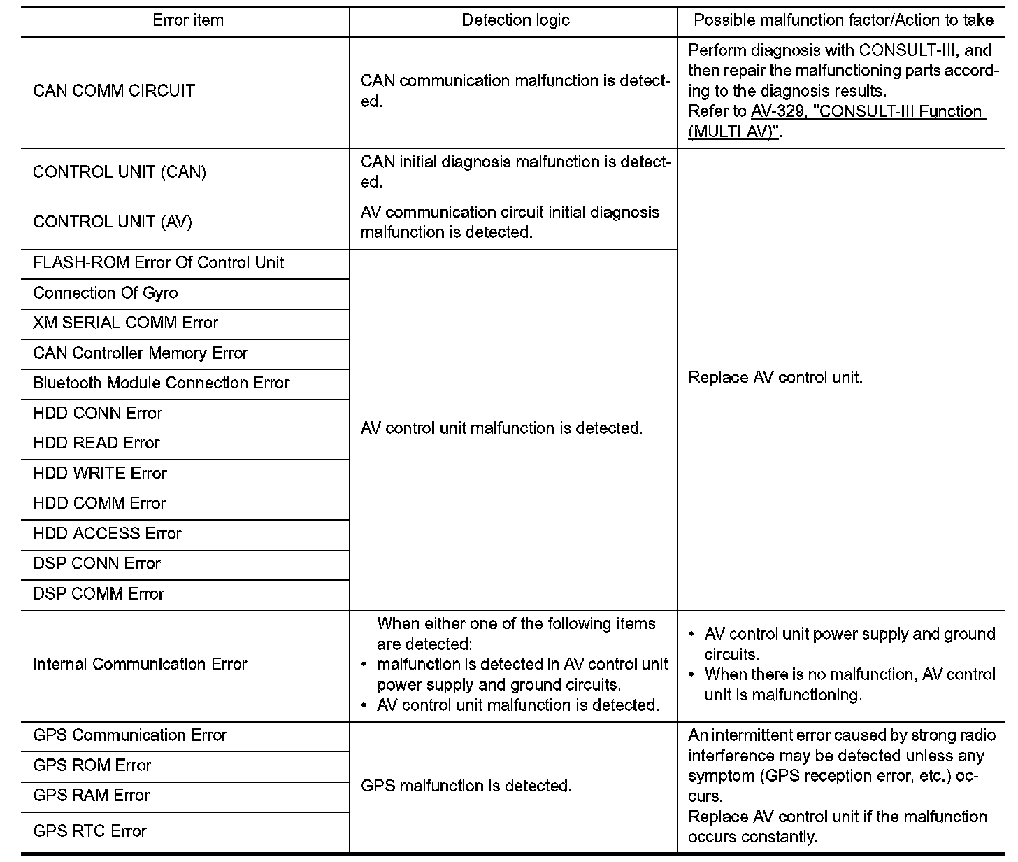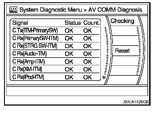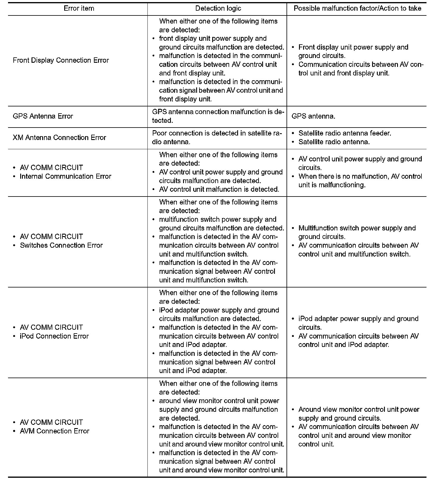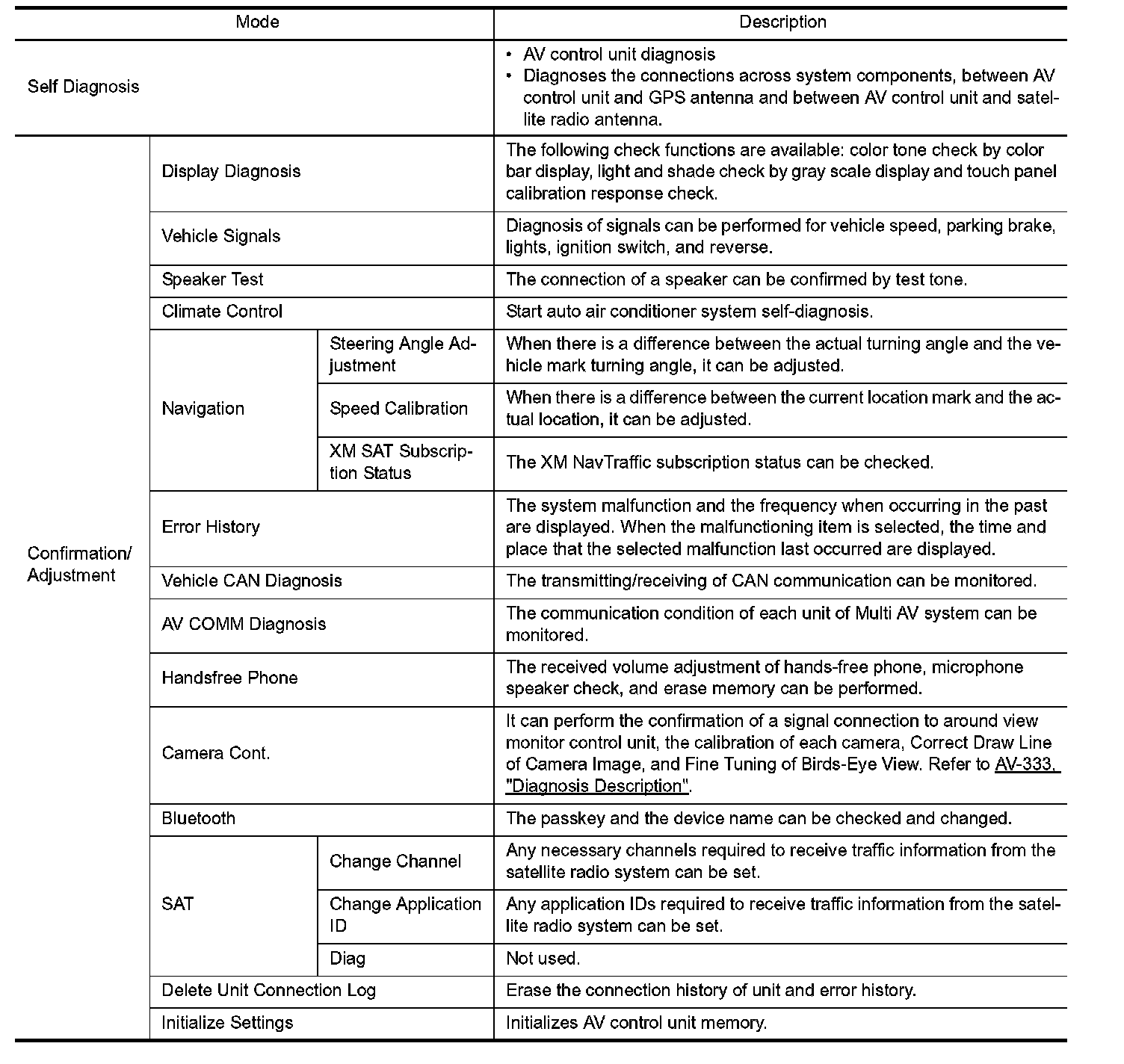 - AV control unit diagnosis function starts up with multifunction switch operation and AV control unit performs a diagnosis for each unit in the system during the on board diagnosis.