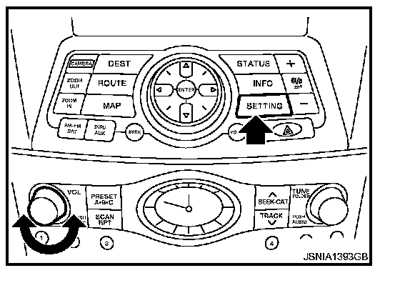 3. While pressing the "SETTING" button, turn the volume control dial clockwise or counterclockwise for 40 clicks or more. (When the self-diagnosis mode is starts, a short beep will sound.)