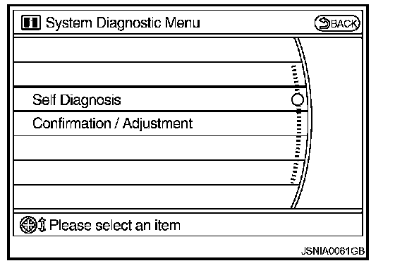 4. The trouble diagnosis initial screen is displayed, and then the items of "Self Diagnosis" and "Confirmation/Adjustment" can be selected.