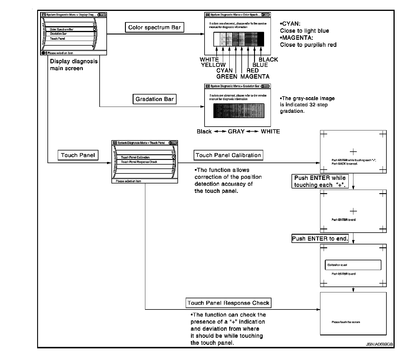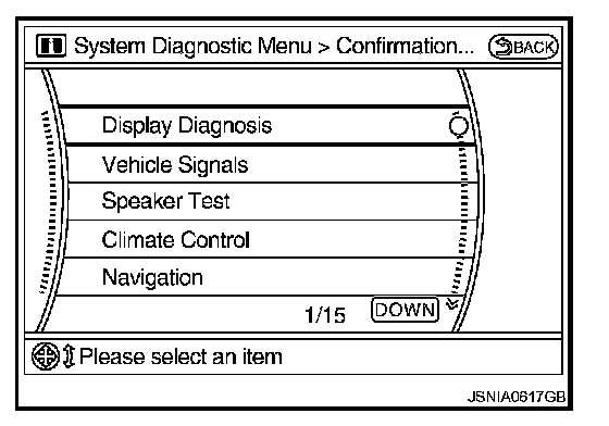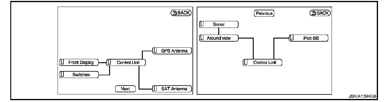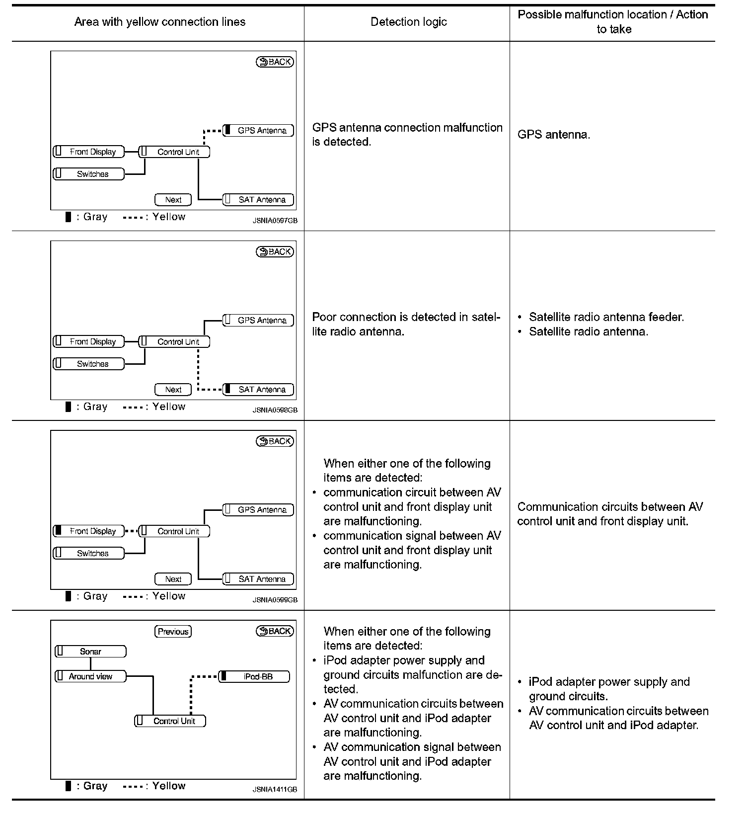- The self-diagnosis mode performs diagnoses on AV control unit, connections between system components, AV control unit and GPS antenna and between AV control unit and satellite radio antenna. Then it displays the diagnosis results on display.
