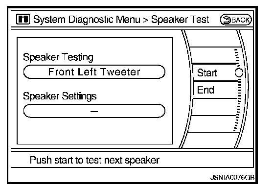 Select "SPEAKER DIAGNOSIS" to display the Speaker Diagnosis screen. Press "START and NEXT" to generate a test tone in a speaker. Press "Start" to generate a test tone in the next speaker.