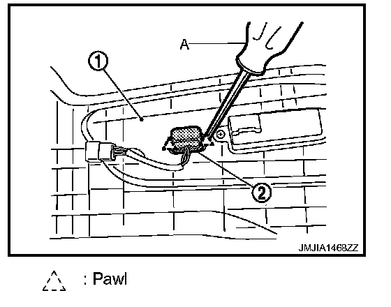 2. Remove the lumbar support switch (2) from the seat cushion outer finisher with flat-bladed screw driver (A).