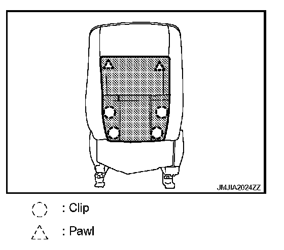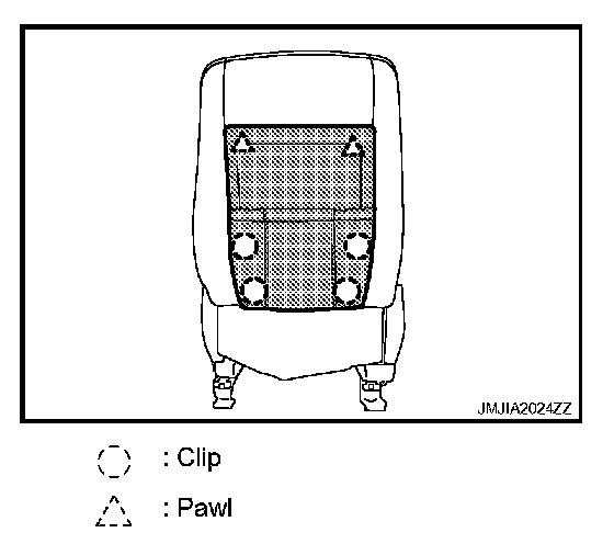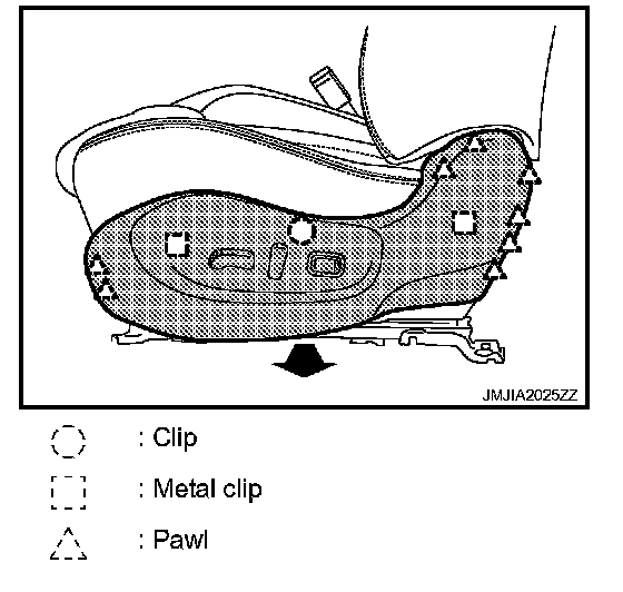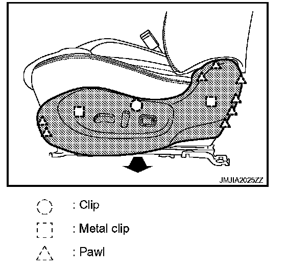 - Remove the clip, metal clips and pawls, and then pull out seat cushion outer finisher.