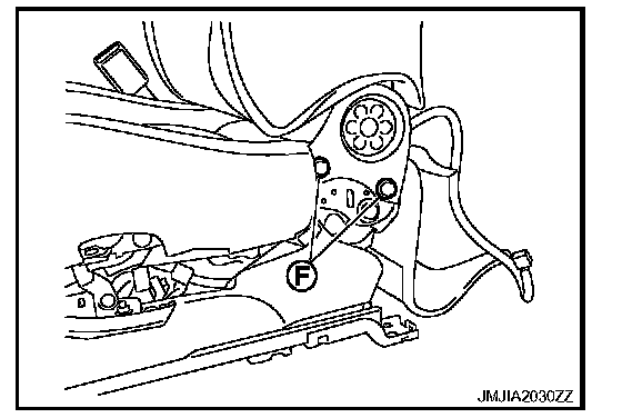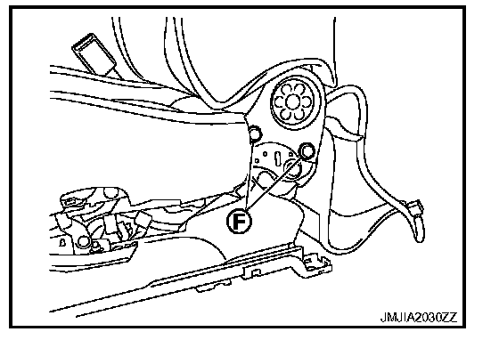 - Remove the seatback assembly mounting bolts (F).